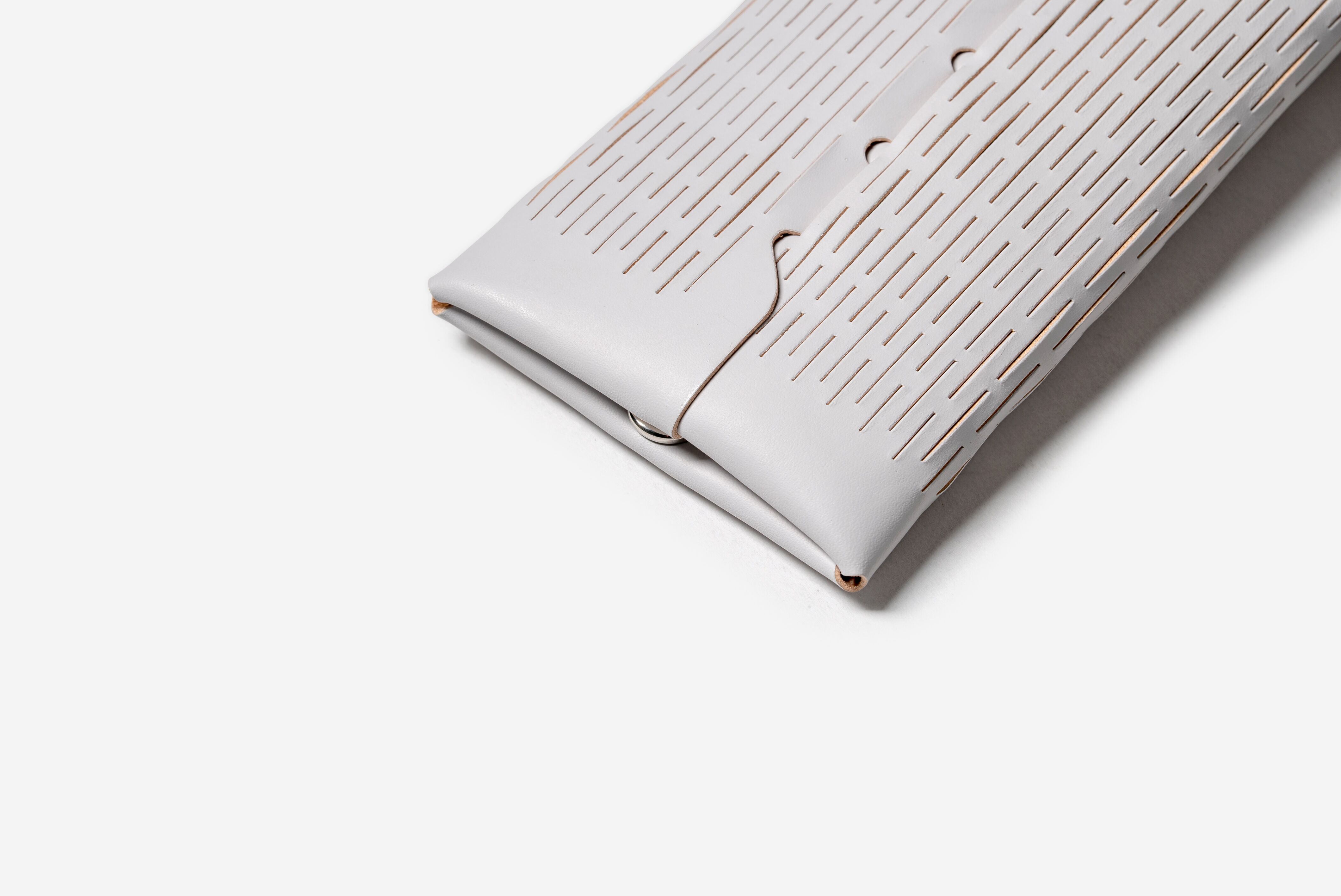 革のメッシュは伸縮自在で、スマートフォン以外にも[ちょっと挟んでおきたいあれこれ]をホールド。